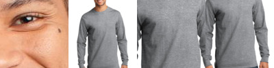100% combed cotton jersey • 4.3-oz. • 32 singles for extreme softness • front cover-stitched 1x1 baby rib-knit set-in collar • tear-away label • Sizes: XS-XL