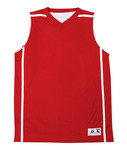 100% Polyester moisture management/ antimicrobial performance fabric • 3.5 oz. • Reversible v-neck tank • Contrast self-fabric stripes • Double-needle hemmed armholes & jersey bottom • Collegiate cut • Badger size jock tag • Sizes: XS-2XL